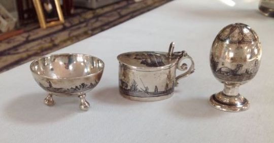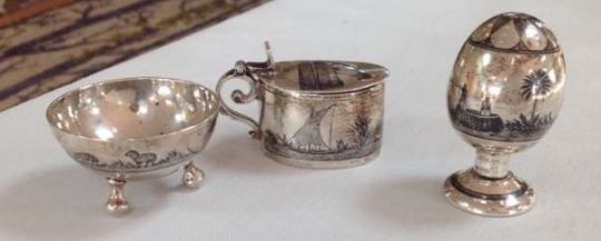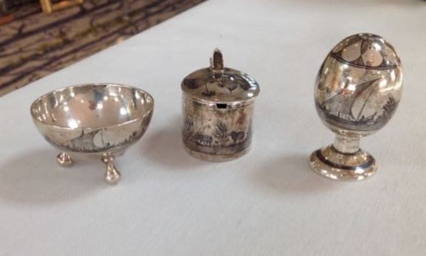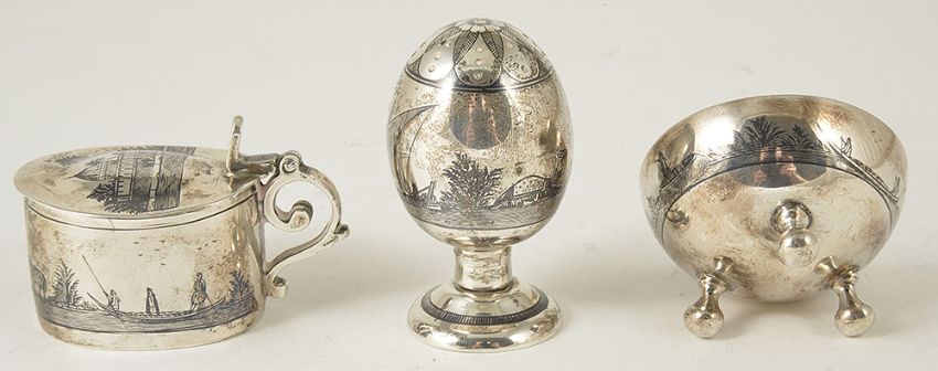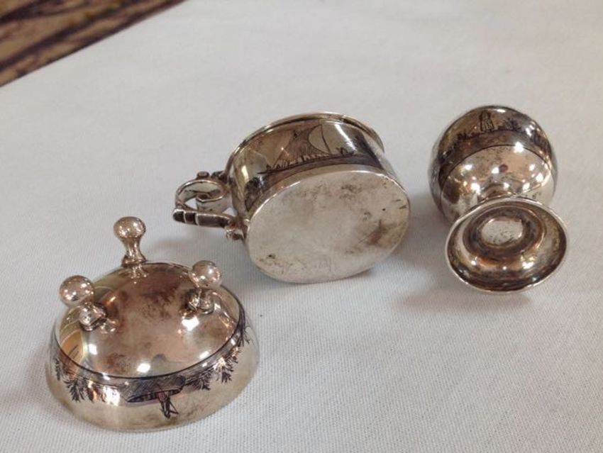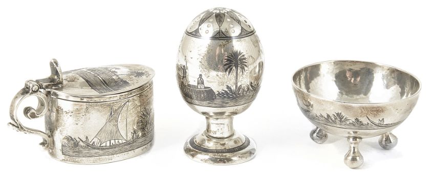 An Egyptian three piece niello decoration cruet suite,