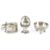 the hinged lid mustard with scroll handle with blue glass liner, circular salt on three supports and pedestal pepperette, bears no marks, (3)