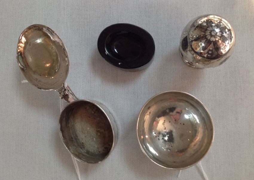 Condition: Good, with minor surface wear, tarnished, no hallmarks, hinge on mustard slightly loose, pedestal base bears slight dent