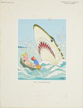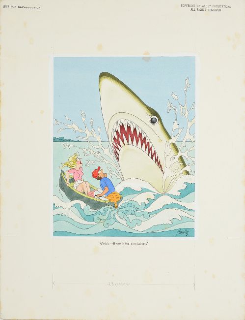 cartoon artwork for Playboy pub. Sep 1991 p.158, drawn: Dec 1989, pen and ink with watercolour, on Daler board, signed lower right, caption below, Copyright Playboy Publications All Rights Reserved & Not For Reproduction stamps top margin, Smilby yellow dot verso, with dust cover sheet