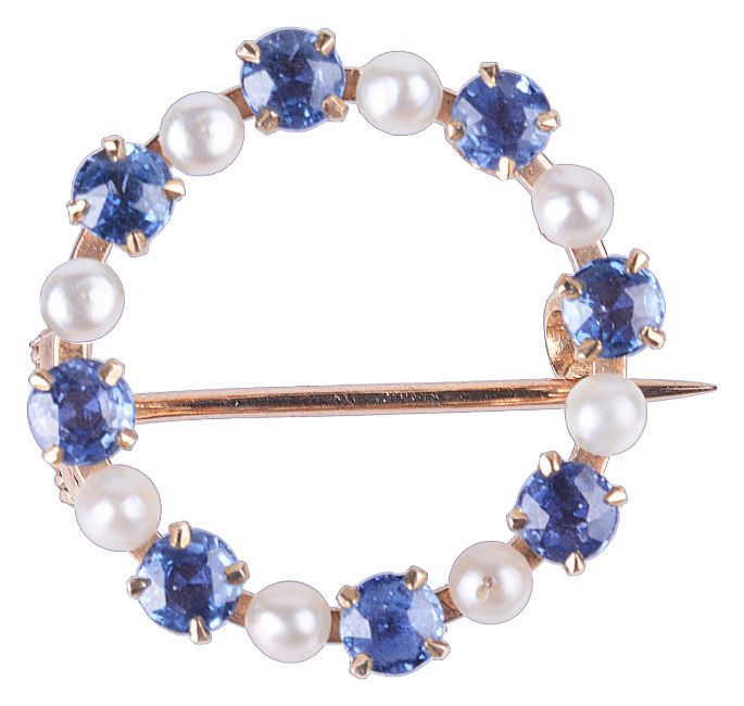 set with alternate blue sapphires and small white 'button' pearls, marked 14K