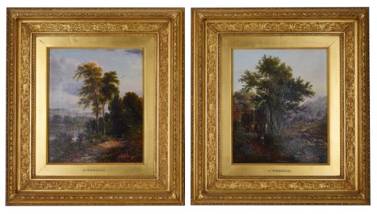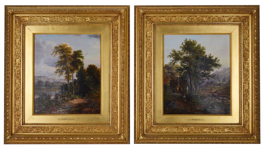 Two lanscapes by a river, oil on canvas, both signed J Westall, both bearing Haynes Fine Art of Broadway Lapada labels verso, (2)