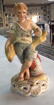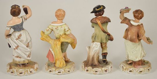 each figurine modelled as a female or male depicting Spring, Summer, Autumn and Winter, each standing on a pierced scrolled shell base, factory to bases, (4)