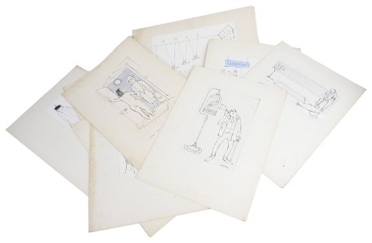 a collection of ten pen and ink drawings on artists paper by Smilby for Punch magazine; a gentleman planting a tree to hang his hammock signed lower left; two gentlemen chatting under a reference sign in a shop signed lower left, blue watercolour colouring; an artist painting flying duck signed lower left; an elderly gentleman standing on a weighing scale listening to his weight signed lower left, a lady hovering a dustbin signed lower left; a gentleman brushing his jacket hanging on a ceiling mobile signed lower right; a gentleman wearing a wine glass on his head after drinking a bottle of wine signed lower right; an elderly gentleman listening to his budgie sing with his hearing horn signed lower right; a nude person greeting Santa at the front door 'What the hell do you want' unsigned, blue watercolour colouring; a gentleman wearing a black cap with a light candle on top, a/f (10)