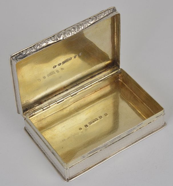 of rectangular form, the hinged lid with foliate acanthus leaf shaped border, the sides and base with engine turned decoration, the interior silver gilt, by Daniel Duff, makers mark DUFF