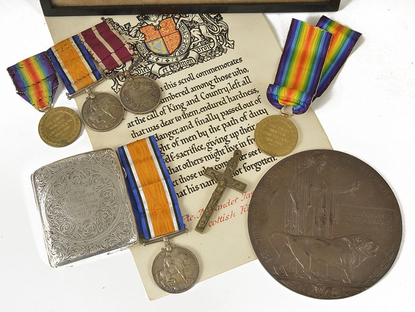 'British War 1914 - 1919' medal 22544 PTE. A. Farquharson. SCO. RIF. with ribbon with a scroll for PTE Alexander Farquharson and a framed photograph of one of the gentlemen and a small brass cross, a/f, (qty)