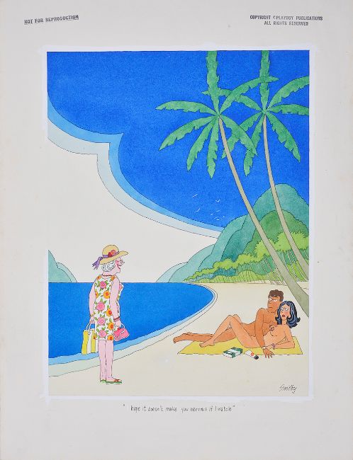 cartoon artwork for Playboy Aug. 1993 pg. 121, drawn: Nov. 1992, pen and ink with watercolour, on Daler board, signed lower right, caption below, Copyright Playboy All Rights Reserved stamp & Playboy Publications Inc. Reproduction Prohibited Without Permission upper margin, Smilby yellow dot verso, with dust cover sheet