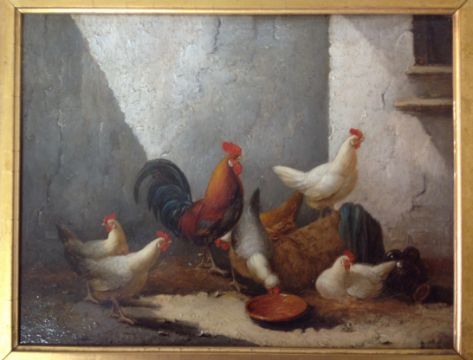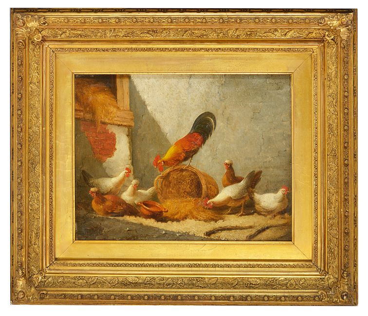 'Cockerels and Hens' farmyard scenes, two oil on boards, signed lower left and dated, ornate gilt frames, one bears part label verso (2)