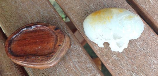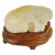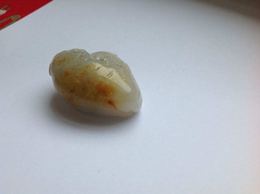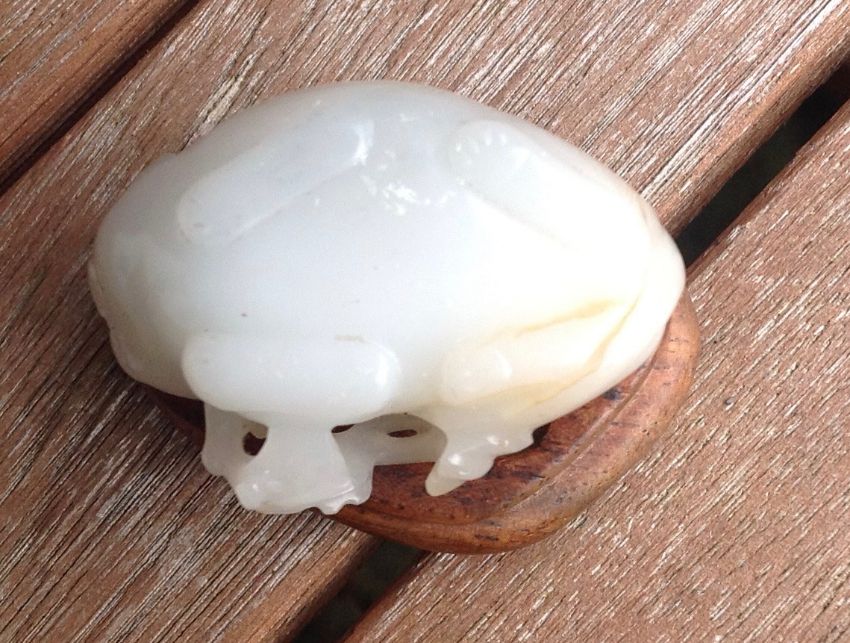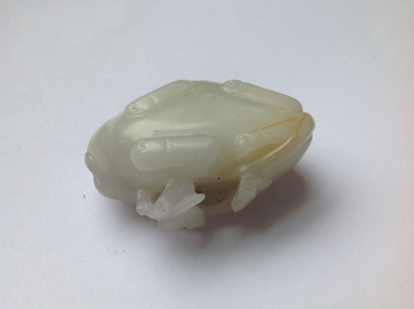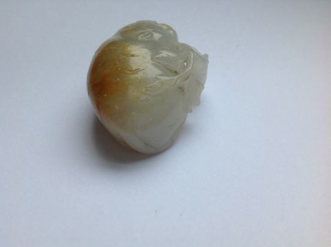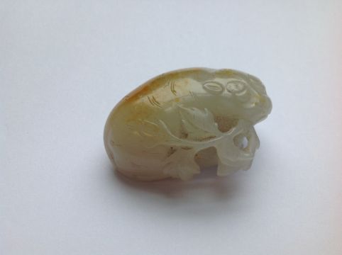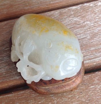 An antique Chinese white/grey and russet jade carving of a cat  the animal lying with curled tail behind a leafy branch, fitted carved hardwood stand measures approx. 50 x 32 x 20mm., approx. weight 37.9 gms. Condition: possible natural crack/flaw incorporated into back paw and hind quarter of cat