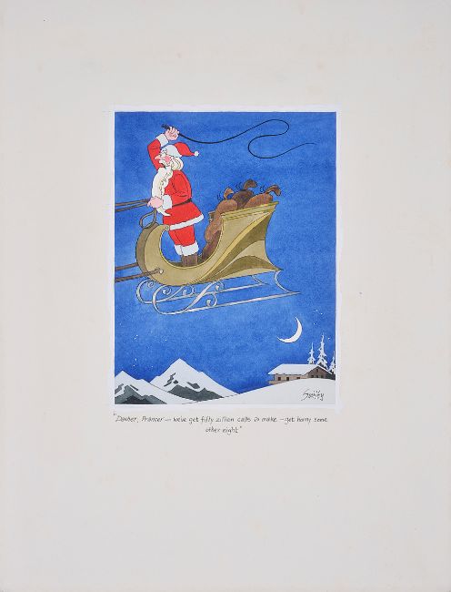 unpublished cartoon artwork, pen and ink with watercolour, on Daler board, signed lower right, caption below, No Playboy Copyright Stamps, Smilby yellow dot verso, with dust cover sheet, together with the artist's paper rough workup for this artwork on conqueror paper, signed lower right, (2)