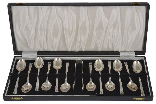 An Art Deco suite of silver teaspoons and sugar nips, hallmarked Sheffield 1935