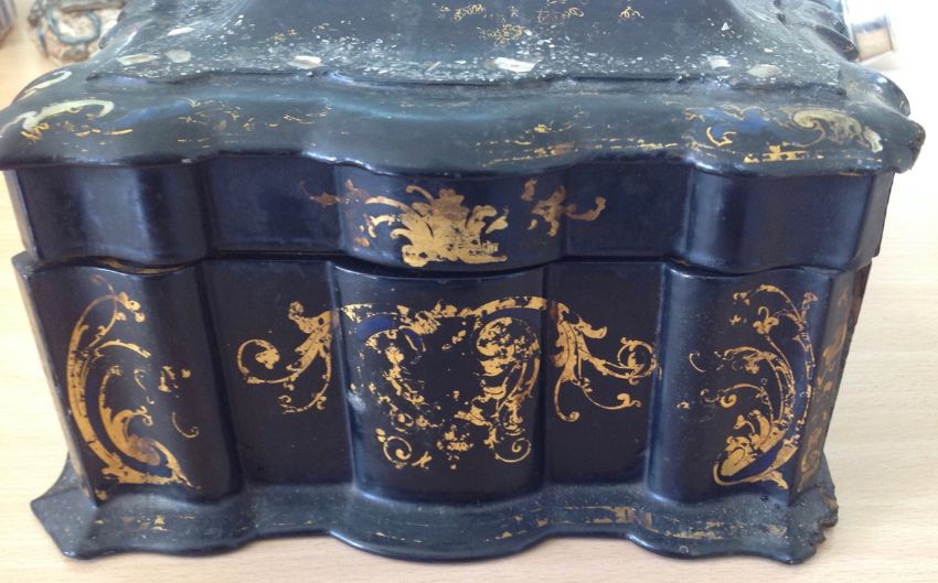 of shaped form with mother of pearl inlay and gilt acanthus painted sides, the interior velvet lined letter holder and painted base, a/f