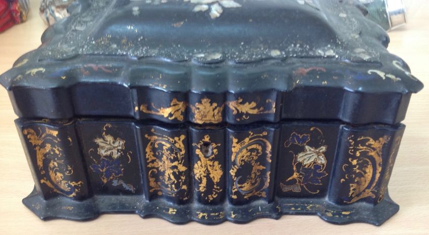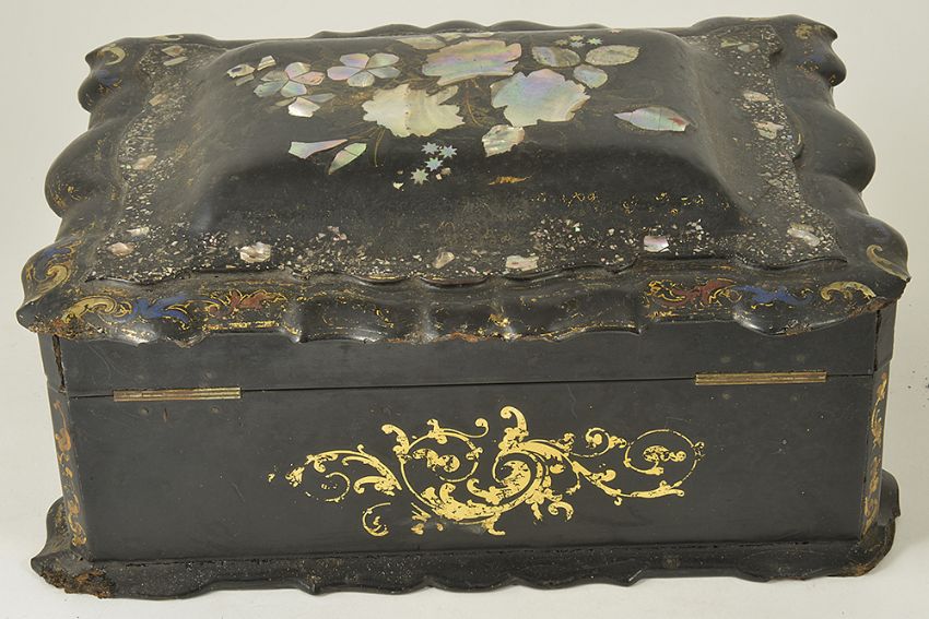 Condition: Fair to good with wear throughout, cracks and fading to papier mache, slight damage to corners, wear to gilding and mother of pearl inlay
