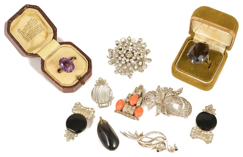 together with a gold mounted amethyst dress ring and several various Art Deco dress clips and brooches (q)