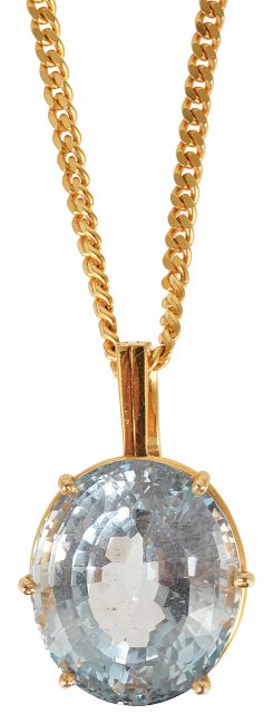 the 14ct gold mount with hinged clip opening for hanging loop, the pendant suspended from a 9ct gold flat curb link neck chain