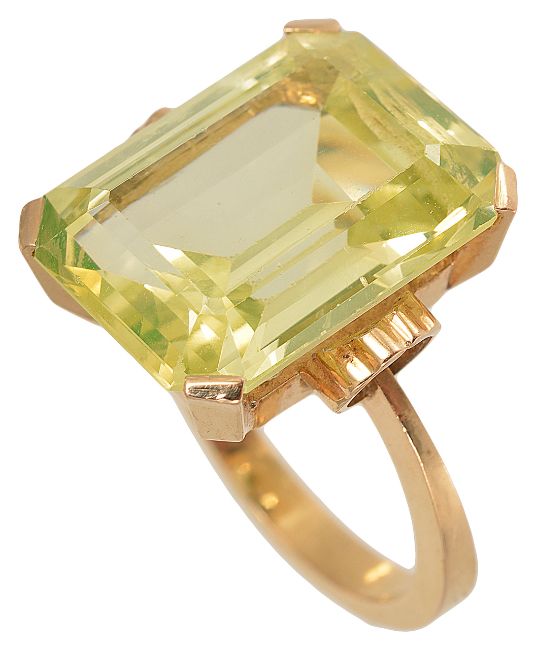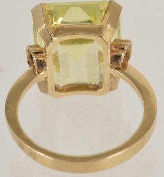 the yellow/green stone lightly fluorescent, marks to outside shank of ring indistinct
