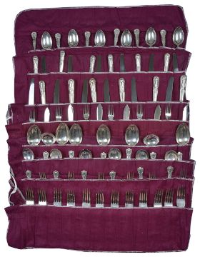 comprising twelve table forks and knives, twelve dessert forks and knives, twelve dessert spoon, twelve soup spoons, twelve teaspoons, six serving spoons, two sauce ladles, makers hallmark MDQ, together with a set of six Mappin & Webb kings pattern silver fish forks and knives, Sheffield 1972, (qty)
