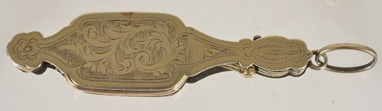 the outside yellow metal casing scroll engraved and tests gold clad on silver, having spring action opening and with pendant hanging loop