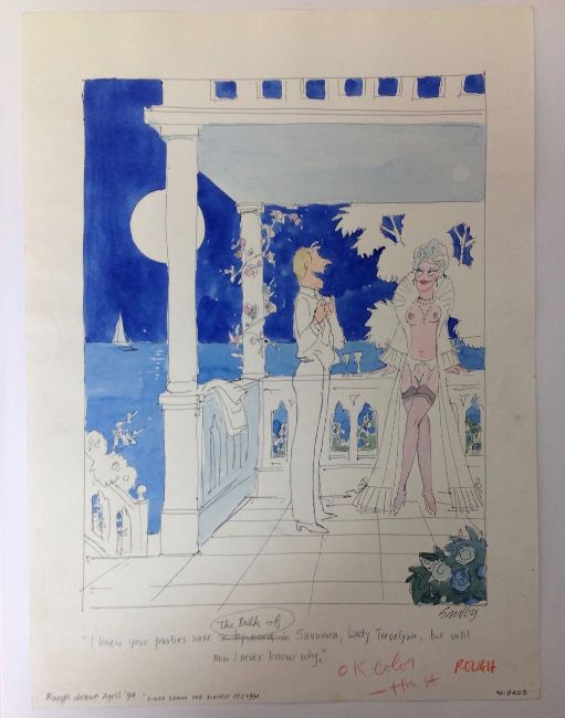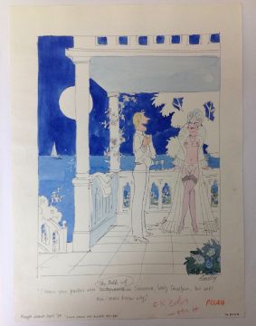 cartoon artwork for Playboy July 1995 pg. 109, drawn: Oct. 1994, pen and ink with watercolour, on artists board, signed lower right, caption below, Copyright Playboy All Rights Reserved stamp & Playboy Publications Inc. Reproduction Prohibited Without Permission margin & verso, mounted in metal frame, together with the artist's paper rough workup for this artwork with the artists notes in the margins, signed lower right and 'Ok Color - HmH' on lower margin in crayon possibly by Hugh Hefner, (2)