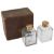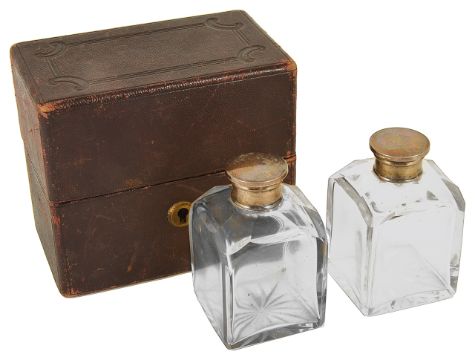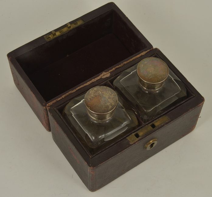 each bottle of squared squat form with original stoppers and silver plated screw lids, contained within a leather covered case