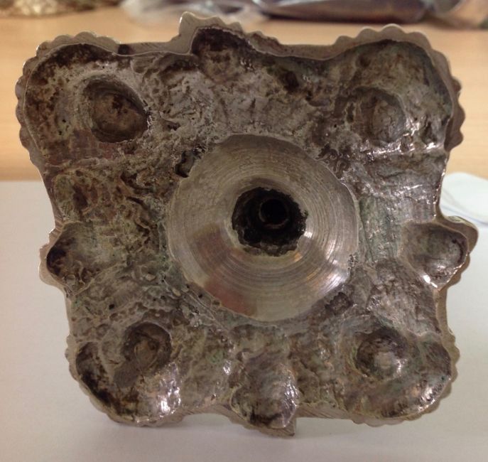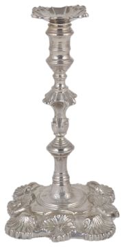 the knopped stem upon square section base with shell motifs with detachable drip tray and engraved armorial to bottom of stem, possibly by Simon Jouet, hallmarks worn