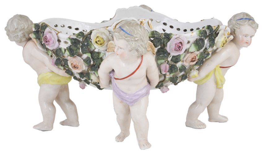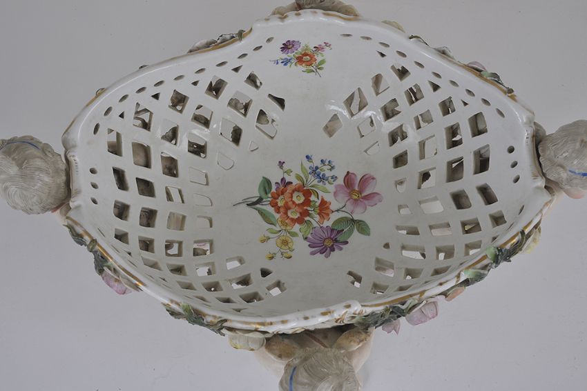 the ovoid pierced basket with applied leaf and rose bud decoration, raised by four standing winged cherubs, the interior of the basket painted with floral sprays, bears impressed mark 314 and blue hatched mark