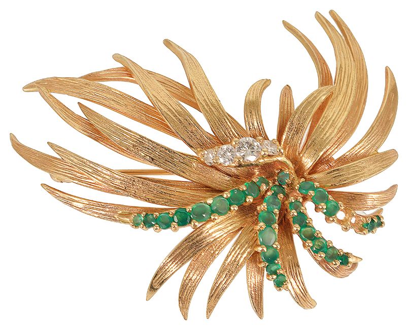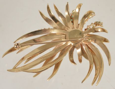 having textured gold leaves with central graduated emerald and diamond set fronds, marked 14K to reverse and stamped P.W.G.