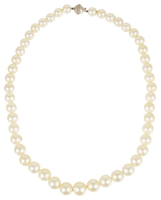 the pearls lightly graduated to either end and of creamy silver hue, the largest measuring approximately 10 mm., having small white gold 'ball' fastening with diamond set band detail