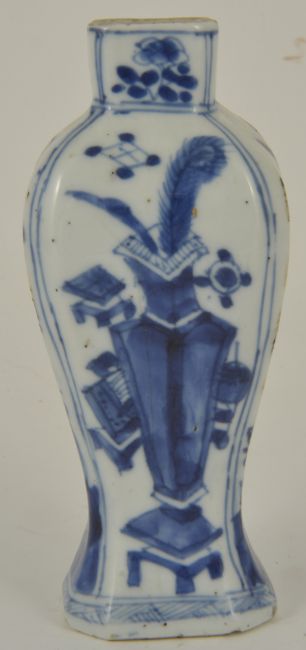 of shaped square section form, the front and back decorated with Taoist objects and blossoms, the sides with prunus blossoms