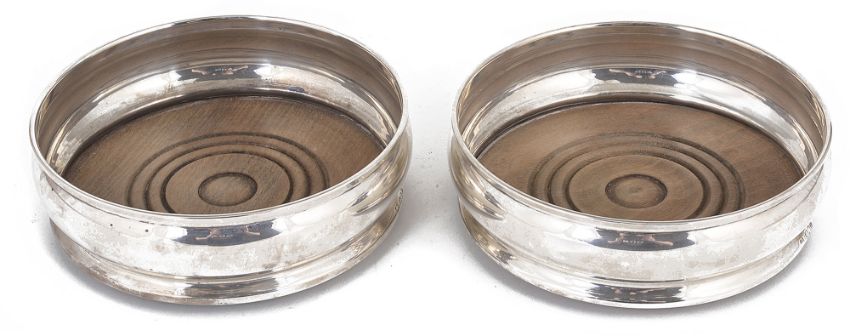 A pair of contemporary silver wine coasters, hallmarked London 1967,