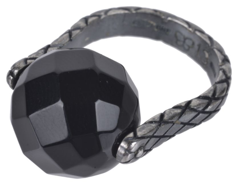 A contemporary Bottega Veneta Italian silver faceted spinning bead ring, the mount oxidised and with lattice detail and fitted with a black facetted glass spinning bead, marked .925 and with B & V mark size H/I