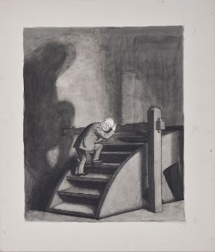 Man walking on a water wheel, ink with watercolour drawing on artists drawing board, signed in ink lower right