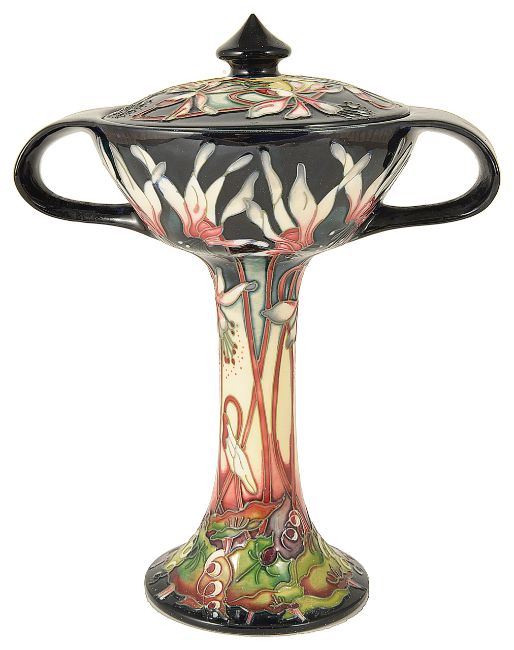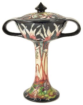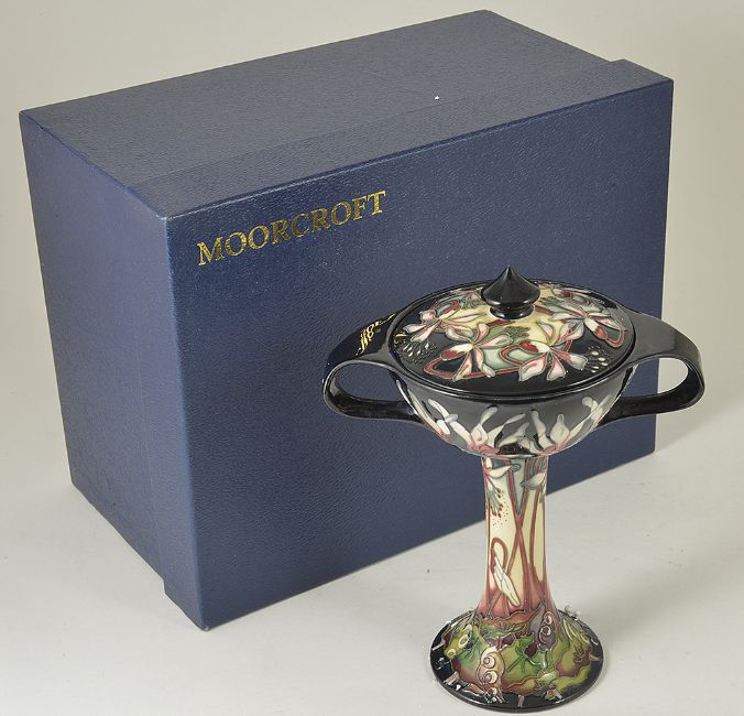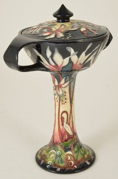 A contemporary Moorcroft Nicola Slaney 'Minuet' bonbonniere with cover, circa 2004