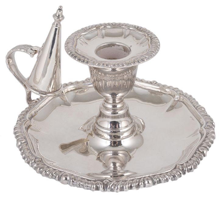 with gadrooned candle sconce above a dished octagonal gadroon decorated tray with acanthus scroll handle, with candle snuffer, by A Chick & Sons Ltd