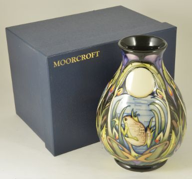 the baluster vase tube lined with carp, a frog and a heron amongst bull rushes, limited edition 4 of 150, bears impressed and painted marks to base with artists signature, with original box