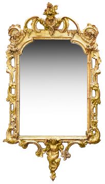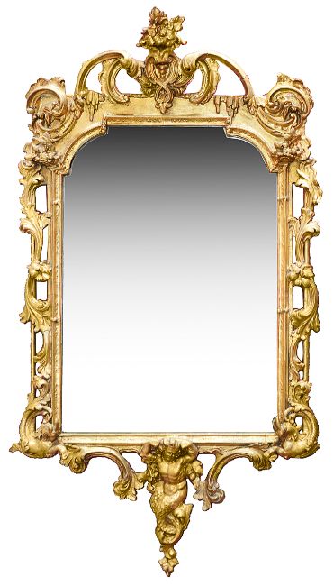 the shaped rectangular partially bevelled plate within a frame of pierced and carved scrolling acanthus leaves with flower heads with a caryatid at the base