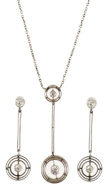 A stylish Art Deco diamond set pendant necklace and matching eardrops