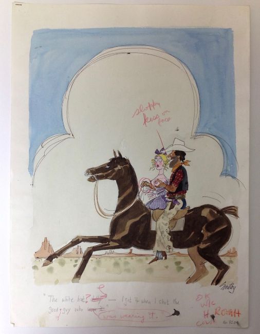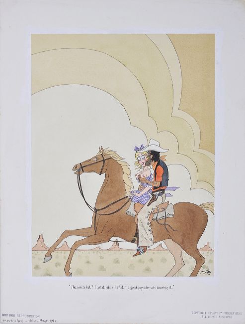 Unpublished cartoon artwork, drawn: Apr. 1996, pen and ink with watercolour, on Arne board, signed lower right, caption below, artists notes lower margin, Copyright Playboy All Rights Reserved stamp & Playboy Publications Inc. Reproduction Prohibited Without Permission lower margin & verso, Smilby yellow dot verso, with dust cover sheet, together with the artist's paper rough workup for this artwork with the artists notes in the margins, signed lower right and 'Ok W/C H Color' on lower margin in crayon possibly by Hugh Hefner, (2)