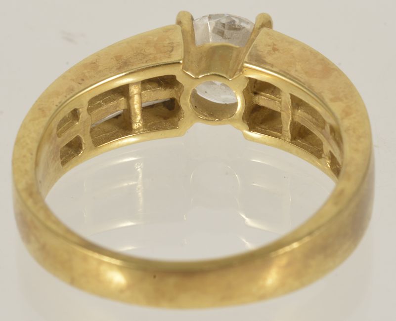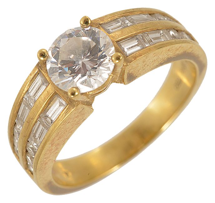 the central stone approximately 0.65 ct. between double row baguette diamond set shoulders and three further graduated, channel set brilliants, 18ct gold mount
