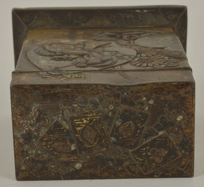 decorated in relief with diamond, heart, spade and club vignettes enclosing figures, junk ship, cat and bird in-flight, the base with raised stamp to base