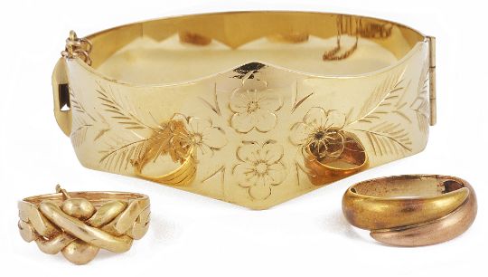 tests for gold, marks rubbed, a 9ct rose and yellow gold twist ring and an engraved 12K rolled gold floral engraved hinged bangle (3)
