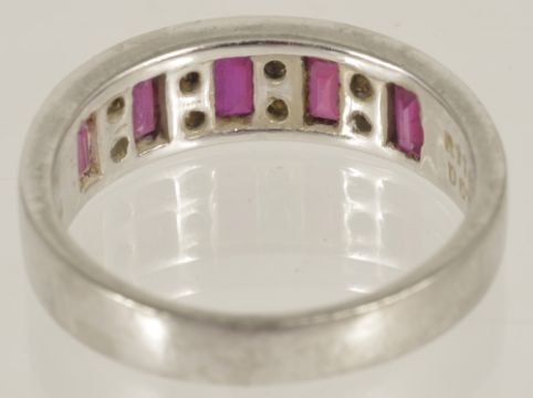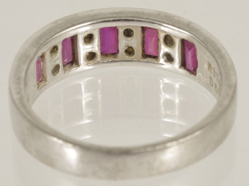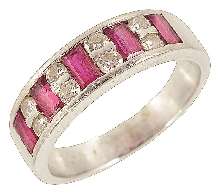 A good quality ruby and diamond set platinum half eternity ring