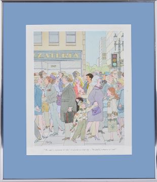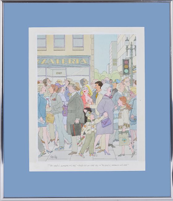 cartoon artwork for Playboy March 1994 pg. 141, drawn: Nov. 1991, pen and ink with watercolour, on artists board, signed lower left, caption below, Copyright Playboy All Rights Reserved stamp & Playboy Publications Inc. Reproduction Prohibited Without Permission margin & verso, mounted in metal frame
