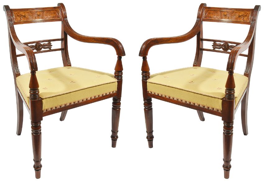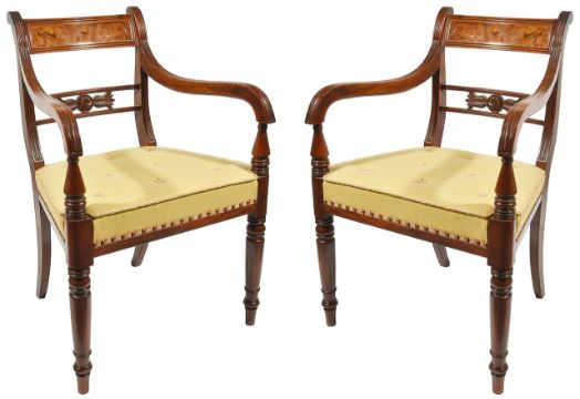 Condition: Good, with wear to mahogany and upholstered seats, signs of old worn to underside, signs of old glue in leg joints