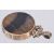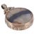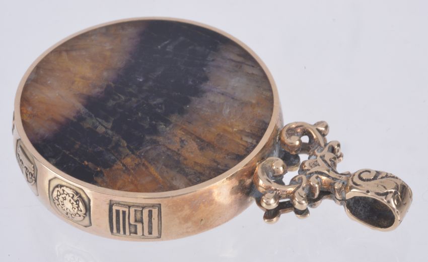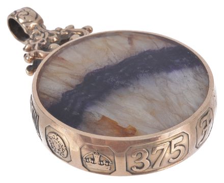 the circular pendant with 'giant' hallmarks to the edge for 9ct gold and maker's mark O.S.W., the centre set both sides with polished bluejohn