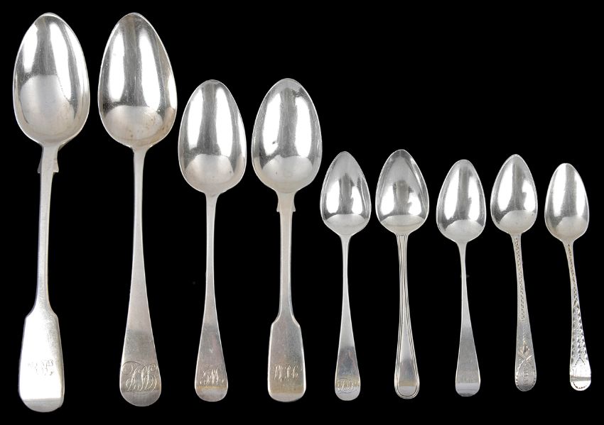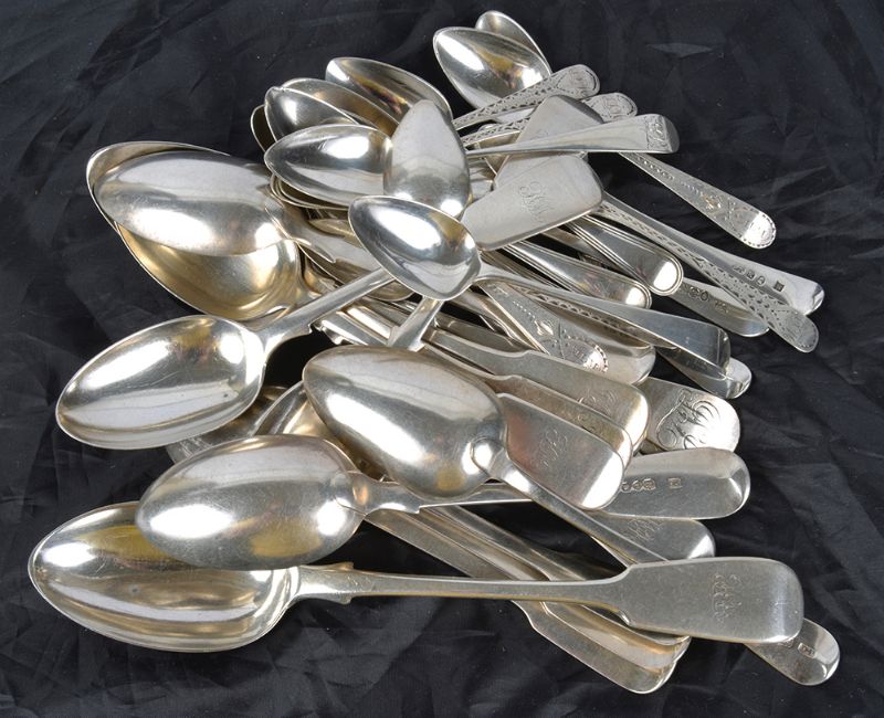 six Victorian fiddle pattern dessert spoons hallmarked London 1862 with makers mark SW; six William IV fiddle pattern dessert spoons hallmarked London 1835 by Charles Boyton; four George III teaspoons hallmarked London 1806, makers mark rubbed; five George III teaspoons hallmarked London 1804 possibly by Stephen Adams; two Victorian serving spoons hallmarked London 1860 possibly by William Smily; four George III teaspoons hallmarked London 1802 by Peter, Ann & William Bateman; two Victorian dessert spoons hallmarked London 1838 by David Phillips; two George III teaspoons hallmarked London 1801 by Peter, Ann & William Bateman; a George III serving spoon hallmarked London 1801 by Peter, Ann & William Bateman and two teaspoons hallmarked London 1805 by Peter & William Bateman, (34 spoons)