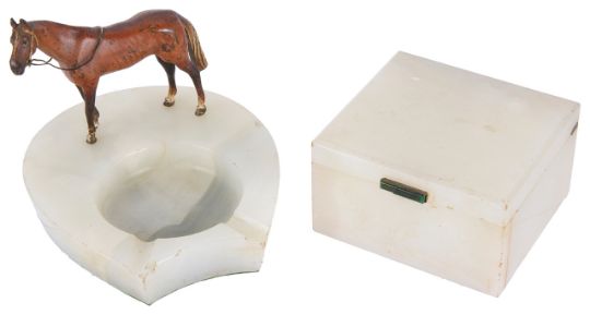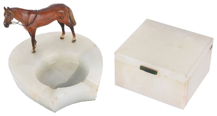 of rectangular form with applied green clasp and a cold painted bronze horse mounted on an alabaster horseshoe shaped ashtray, no marks, a/f, (2)