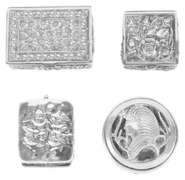 two embossed with flower heads and the other with winged angels, each hallmarked with 925 and a circular pill box with an Egyptian head decorated cover, (4)