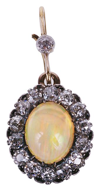 An attractive Edwardian "jelly" opal and diamond cluster pendant,