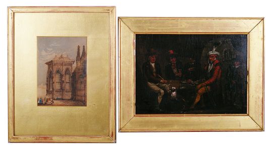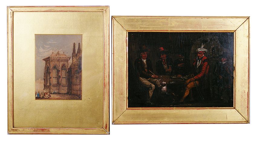 Condition: Fair with wear to each frame, crackling to oil on board, watercolour faded